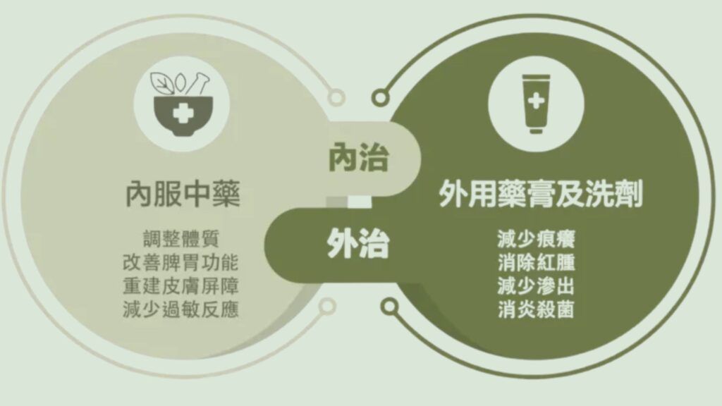 使用西醫處方的類固醇藥物能即時止癢,但只要一停用便會復發,久而久之效果亦都變弱,而中醫治療是透過調整臟腑氣血的平衡,促進皮膚的自我修復能力,副作用少並能減少復發機會。