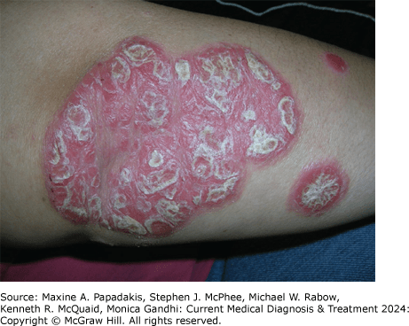 - 特徵為界限清楚的紅色斑塊,覆蓋銀白色鱗屑。