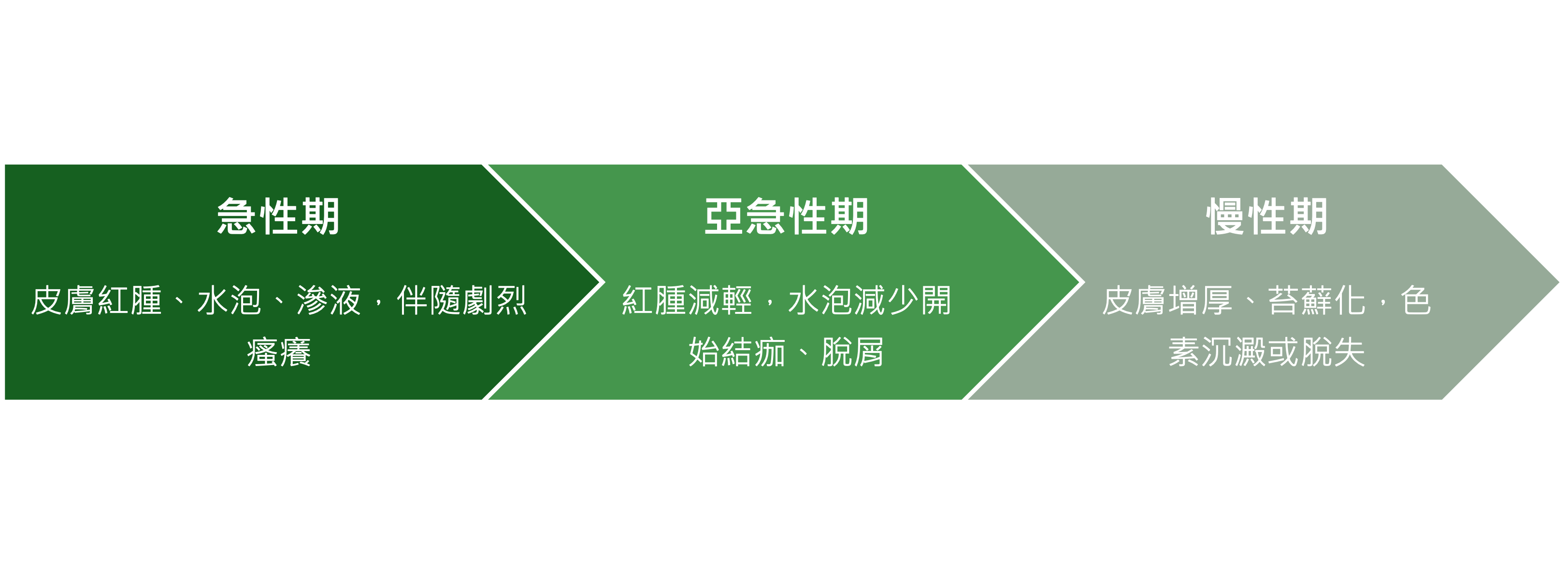 皮疹形態:急性期可能出現水泡、滲液;慢性期則皮膚增厚、苔蘚化。
